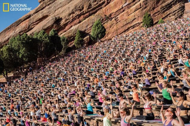 米国コロラド州デンバー郊外のレッドロックス野外劇場で開催された「ヨガ・オン・ザ・ロック」。2100人が参加した。米国では、ストレス解消と健康増進の方法としてヨガの人気が高まっている(PHOTOGRAPH BY ANDY RICHTER)古代インドで誕生したヨガは、現代のストレスを軽くしてくれると、世界各地で実践者が増えている。米国では、健康維持法の一つとして奨励され、悟りを開いたり、さまざまな病気を治療したりする方法としても注目されている。ナショナル ジオグラフィック2020年1月号のテーマ「健康に生きる」では、ジャーナリストのフラン・スミスが、最新の科学的な研究を紹介しながら、ヨガが私たちにもたらすものをリポートする。